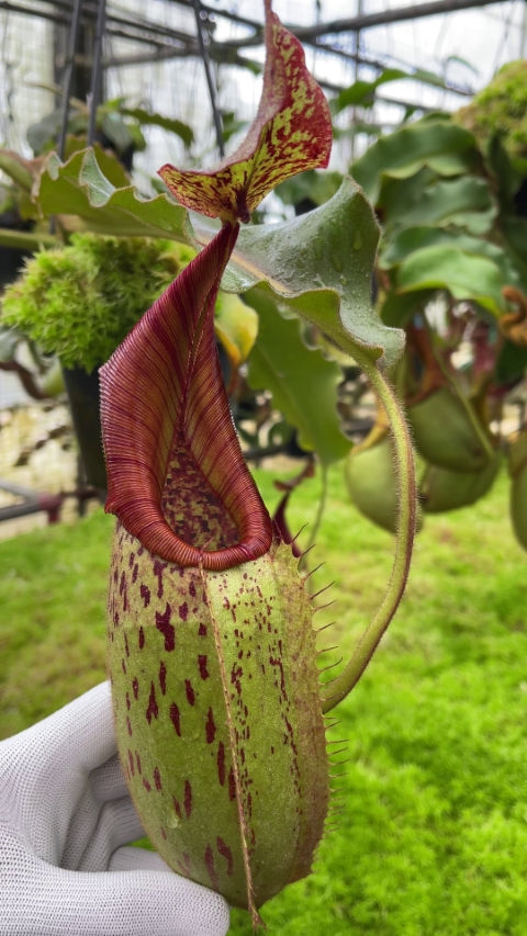 Named for its characteristic bristles on the upper surface of the pitcher lids, this elegant species is one of the most diminutive. It’s unusual for a highland Nepenthes species, in that it’s usually found growing in shaded areas on the forest floor.